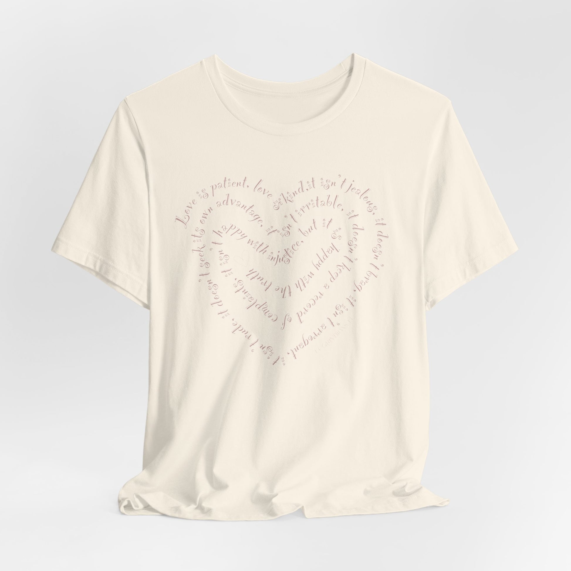 Soft, thoughtful, and quietly powerful — this tee carries 1 Corinthians 13 hand-scripted into a heart across the chest. For whether you’re running errands, meeting friends for coffee, or sitting in a quiet morning of reflection. The heart-script design feels personal, like a tucked note or a well-loved hymn, and sits naturally with jeans, a cardigan, or layered under a jacket for cooler nights. Wear it to church gatherings, small group nights, or when you want a subtle symbol of faith that invites conversation without shouting. The understated script and neutral silhouette make it a calm, everyday piece that settles into your wardrobe and your life.