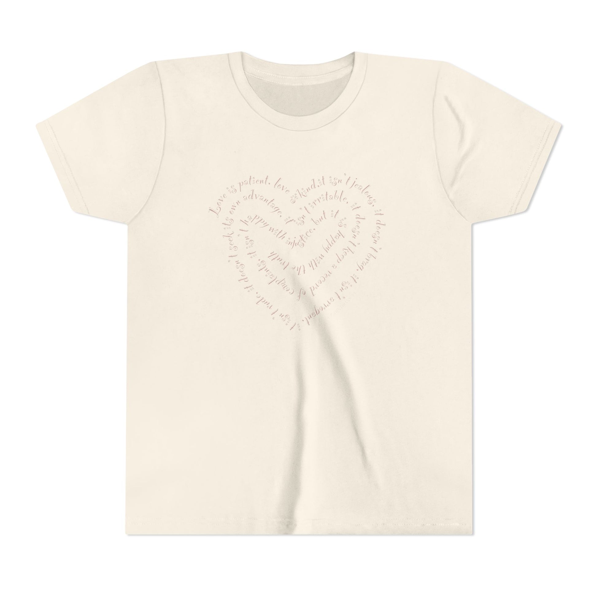 This youth tee feels like a quiet, warm hug. The soft, lightweight cotton drapes gently over small shoulders while the hand-drawn heart script on the chest reads like a whispered note — tender, simple, real. It sits with a modern retail fit and a neat crew neckline that layers easily under jackets or wears solo on bright afternoons. Built with durable side seams, shoulder tape and a ribbed collar, it keeps shape through play and laundry. Tear-away labels and ultra-soft airlume-combed cotton mean no scratchy distractions — just comfort that lasts. A subtle, wearable piece for days spent exploring, drawing, and being kind to others.